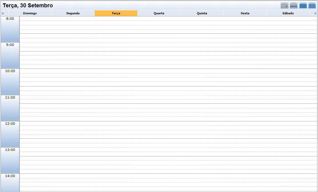 Como podemos ver na imagem abaixo o dia que está sendo visualizado aparecerá em destaque amarelo, a data será destacada no canto superior a esquerda e o evento, no horário agendado (quando existir).
