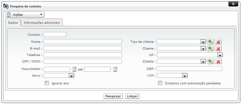 Após selecionar a opção de pesquisa de contatos na Toolbar, o Sistema Qualitor exibirá uma nova janela com vários filtros para que o atendente possa localizar um ou mais contatos, de acordo com a sua necessidade.