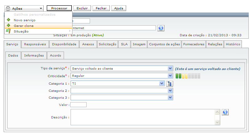 O clone de serviços gera serviços iguais, porém com nomes e códigos diferentes. Para isso, basta utilizar o menu: “Ações / Gerar Clone”.