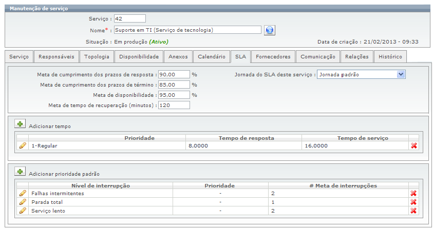 SLA’s podem também ser definidos para cada serviço. Isso significa que cada solicitação relacionada ao serviço pode ter tempos específicos de resposta e término de acordo com a prioridade.