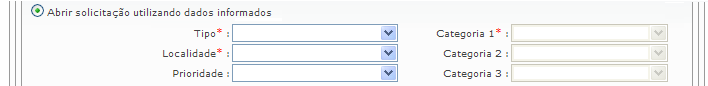 • Abrir solicitação utilizando dados informados: com esta opção diversos campos de uma solicitação são apresentados para serem preenchidos. Uma solicitação será gerada com estas informações específicas. Estes são alguns dados que são definidos em modelos de requisições.