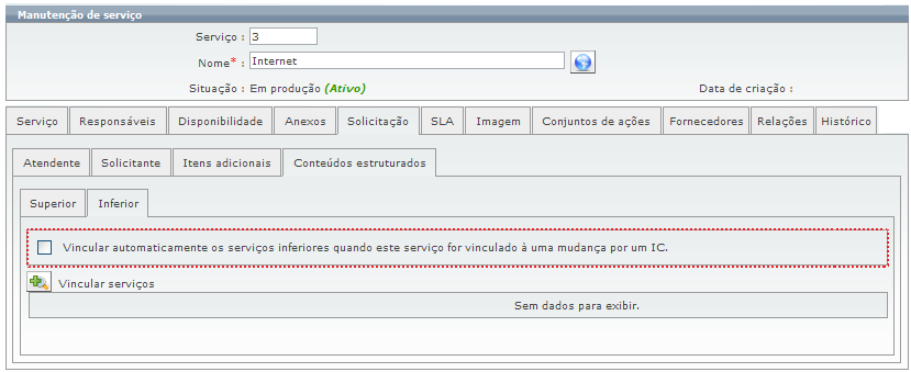 Em outras palavras, “Internet” é o serviço-pai, que tem outros serviços relacionados abaixo dele. Portanto, quando na mudança for adicionado um IC (guia Impacto) que esteja relacionado a um serviço, toda a estrutura abaixo deste serviço será impactada, sendo então mostrada na guia “Impacto”, colapse “Serviços”.