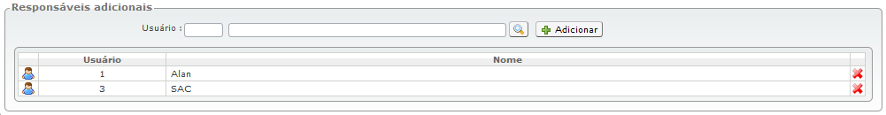 Nesta tela será possível adicionar o usuário superior do atendente para que ele também tenha a permissão de edição da mudança. Os atendentes e usuários superiores adicionados como responsáveis adicionais serão listados em uma grid identificados como usuário, com a possibilidade de exclusão de seus registros: