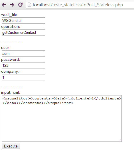 A aplicação pode passar a acionar a camada Stateless, realizando “POSTS” de informações no endereço do Qualitor: “http://servidor/caminho/ws/statelessws.php”. Veja o modelo abaixo: