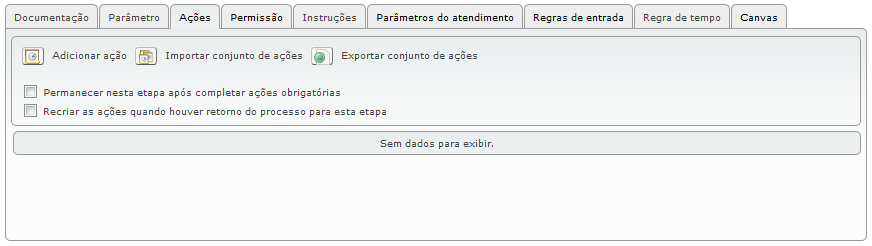 Nesta guia é possível adicionar ações ou conjunto de ações para serem executadas quando uma requisição alcançar esta etapa do processo, podendo ser realizadas de forma obrigatória ou não.