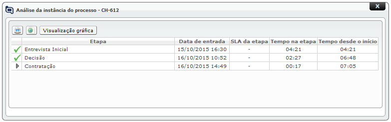 O botão "Visualização gráfica", permite visualizar de forma gráfica as etapas em que o processo já passou, conforme exemplo: