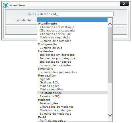 Para criar um novo bloco, deve-se colocar um “Título” e neste caso, selecionar a opção “Relatórios SQL”: