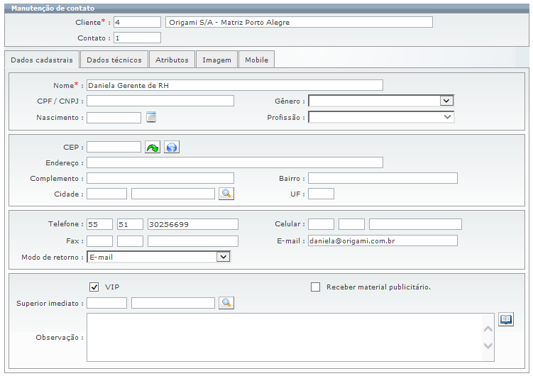 Além dos dados gerais, é possível cadastrar qual o “Modo de retorno” preferencial deste contato, que pode ser escolhido como telefone, celular, fax ou e-mail. Como também selecionar o contato como “Vip” e também indicar seu supervisor imediato.
