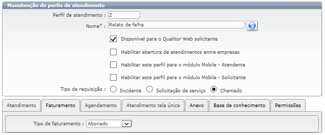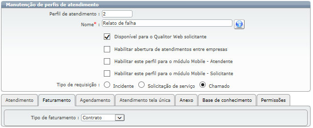 << <%SKIN-STRTRANS-SYNTOC%> >> Navegação: ADMINISTRADOR > Administração > Menu “Requisições” > Perfil de atendimentos > Guia “Faturamento” |