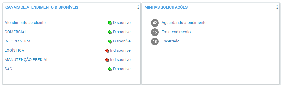 Por padrão são mostrados o catálogo de serviços, e os atendimentos visíveis para o solicitante logado no portal. Mas é permitido a configuração de "Blocos".