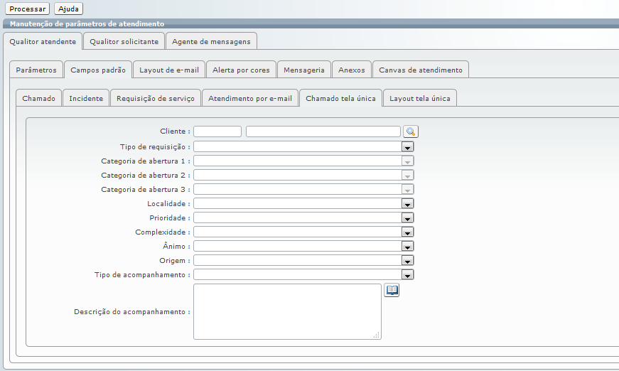 No Qualitor é possível personalizar o layout e o funcionamento do “chamado tela única”. Nos parâmetros de requisições podemos observar a configuração disponível para determinar os valores padrão que serão utilizados ao exibir a tela: