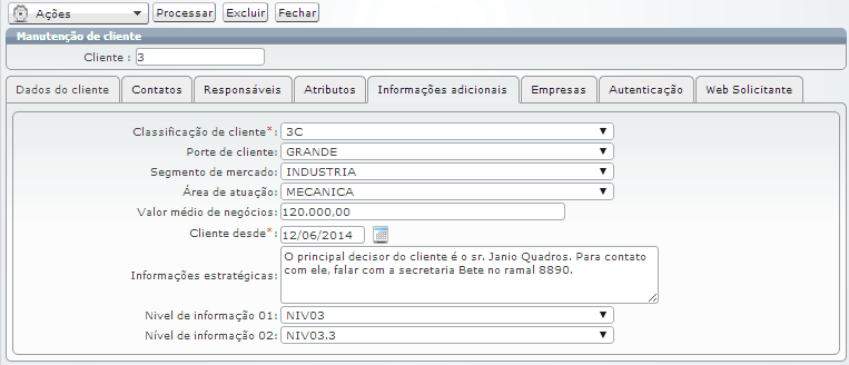 No cadastro de clientes e contatos é possível associar informações adicionais. Estas informações adicionais permitem que os dados sejam mais detalhados de acordo com a necessidade dos clientes.