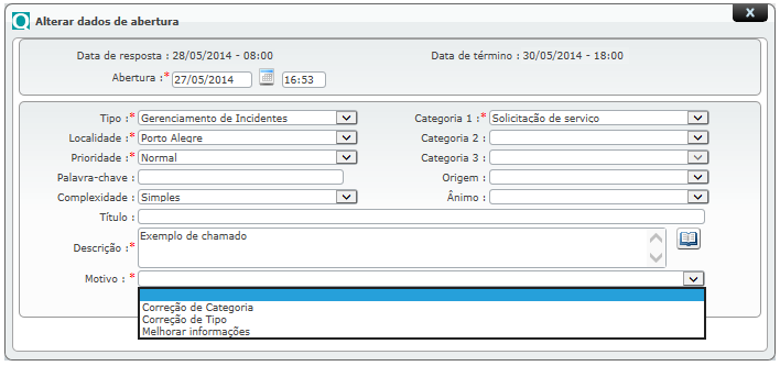Na requisição, ao utilizar o menu “Ações / Alterar / Dados de Abertura”, o Qualitor irá mostrar os motivos de alteração ativos.