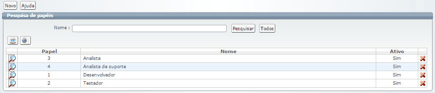 Acessando o cadastro de papéis, é possível observar a lista de papéis disponíveis (e também realizar o seu cadastro):