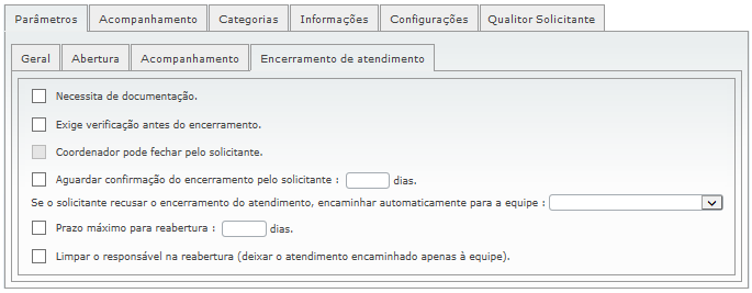 Na subguia “Encerramento de atendimento”, são definidos os seguintes parâmetros: