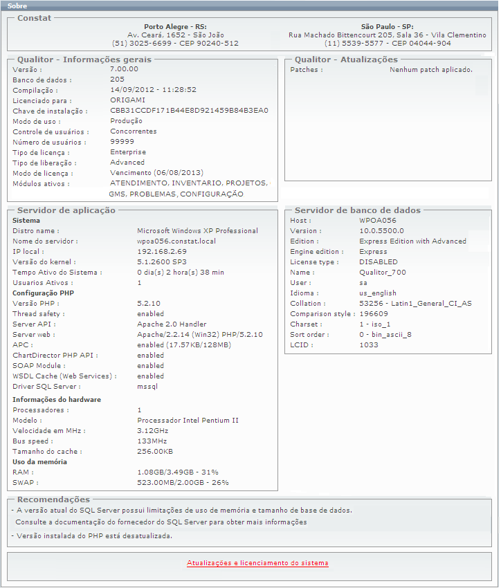 Na área de “Recomendações” é apresentado um sumário acerca da configuração sendo utilizada para o Qualitor. Alguma eventual sugestão de ajuste, para adequação no ambiente e infraestrutura, também poderá ser apresentada nesse campo.