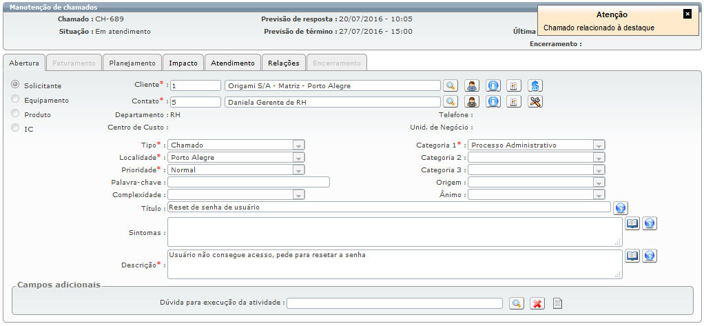 Um chamado pode ser relacionado a um chamado destaque. Neste caso, quando for aberta a tela de um chamado, aparecerá no topo da tela do chamado principal a mensagem “Chamado relacionado à destaque”.