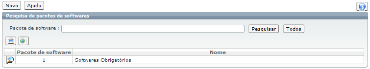 Para criar um pacote de softwares, deve-se clicar no botão “Novo” e será exibida a tela de cadastro. Um nome deve ser dado ao pacote e em seguida softwares que o compõe podem ser vinculados.