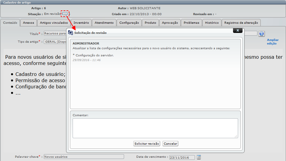 No resultado da pesquisa é possível acessar um artigo que esteja aguardando a aprovação do atendente conectado e realizar os ajustes que forem necessários. Também é possível visualizar as solicitações de revisão dentro da própria edição do artigo: