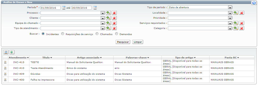 Ao acessar a opção "Known X New" será apresentada a tela para definir os filtros para a grid ser executada. Após os filtros definidos, basta clicar no botão "Pesquisar" e será exibida a grid com os resultados: