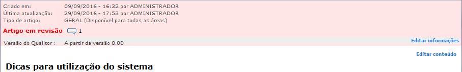 Na parte superior do artigo pode-se observar que consta a data de criação, a data da última atualização, o tipo de artigo e também a última revisão que ocorreu neste artigo.