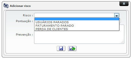 Na tela para adicionar riscos, eles podem ser escolhidos a partir de uma caixa de seleção que apresenta os riscos de projeto já pré-cadastrados. Informa-se ainda uma pontuação, que serve como referência para o risco, bem como uma descrição de possíveis prevenções para os mesmos.