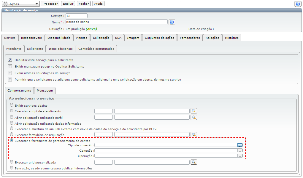 Nesta tela, o parâmetro "Habilitar este serviço para o solicitante" deve estar marcado, para que os demais parâmetros possam ser configurados. Então, na subguia "Comportamento" deve-se marcar o parâmetro "Executar a ferramenta de gerenciamento de contas", conforme seguinte imagem: