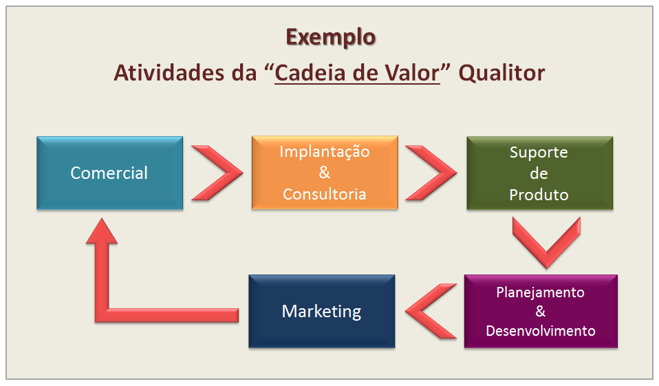 Estas atividades mostram de uma forma geral como a empresa funciona para agregar valor ao produto e constituem a cadeia de valor da empresa, que nesta caso é o "Qualitor".