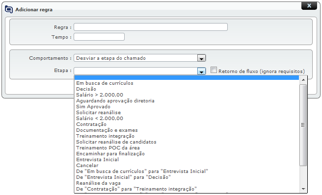 Deste modo, conforme configuração da "Regra de tempo" do exemplo acima, quando a requisição chegar na etapa "Em busca de currículos" e atingir o tempo estipulado nesta regra que foi configurado como 30 minutos, então a requisição será desviada para outra etapa que será "Solicitar Reanálise" e assim seguirá o processo.