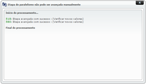 Ao clicar na opção "Avançar etapa", o sistema irá exibir a quantidade de chamados dentro do mesmo processo e da mesma etapa, conforme seguinte exemplo: