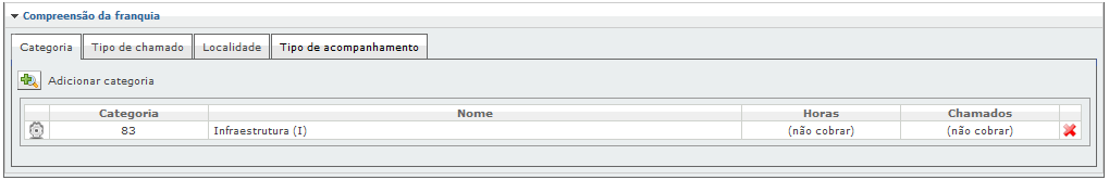 É uma opção útil para definir chamados cuja categoria seja de atendimento ilimitado. Conforme o exemplo abaixo, as horas de atendimento ou quantidade de chamados para Infraestrutura serão abonados do limite total da franquia.