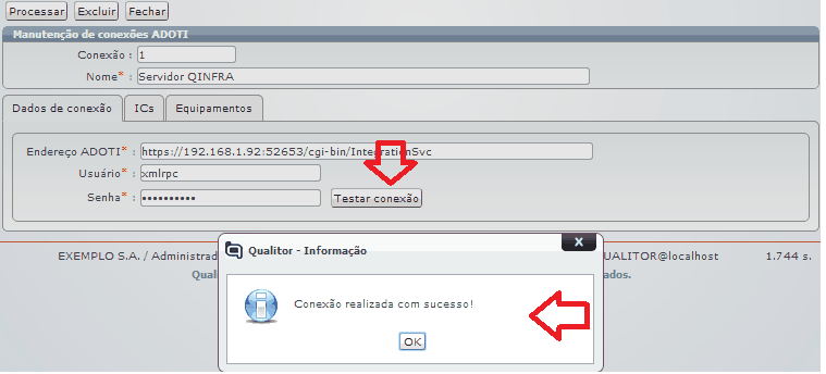 Endereço ADOTI: É o caminho “URL” de conexão ao servidor do QualitorInfra. Conforme acima, o endereço de conexão ao QualitorInfra consiste em um acesso “http ou https”, e respectivo endereço do servidor e porta. A conexão é realizada diretamente aos WebServices XMLRPC do QualitorINFRA, portanto, o caminho adicional “/cgi-bin/IntegrationSvc” é necessário para que o Qualitor possa realizar a conexão com sucesso.