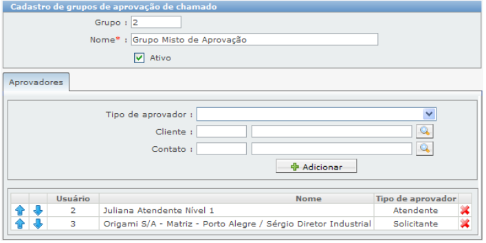 Em um mesmo grupo de aprovação, podemos adicionar um ou mais aprovadores (Atendentes e Usuários finais), conforme o exemplo a seguir: