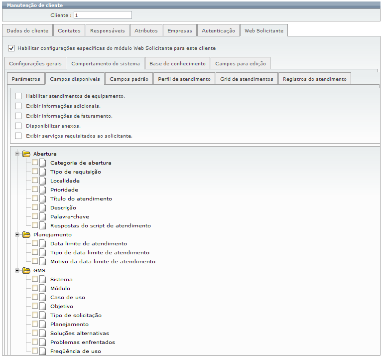 << <%SKIN-STRTRANS-SYNTOC%> >> Navegação: ADMINISTRADOR > Administração > Menu “Clientes” > Clientes > Guia “Web Solicitante” > Subguia “Comportamento do Sistema” > Guia “Campos disponíveis” |