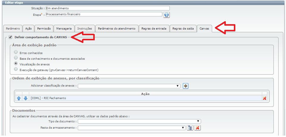 Nas configurações de ETAPAS dos fluxos de atendimento, é possível definir também um comportamento padrão para o CANVAS. Funciona da seguinte forma: Quando um chamado, incidente ou requisição de serviço possuir um fluxo atribuído à ele, e este estiver em uma etapa configurada para definir um comportamento do CANVAS específico, então será utilizada a configuração existente na etapa. Caso contrário, então será utilizada a configuração existente na categoria.