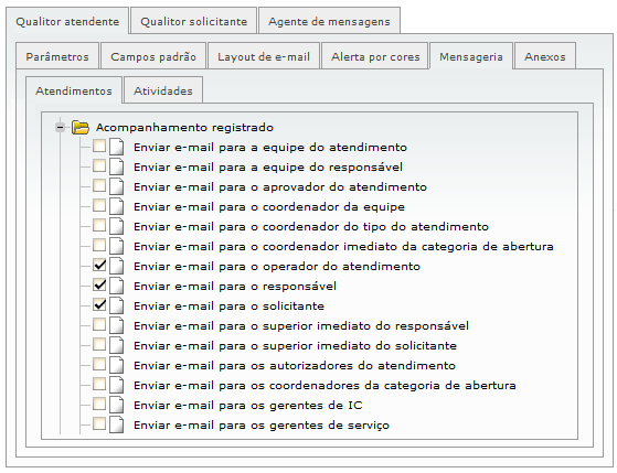 Na guia “Mensageria”, é possível ser realizada as configurações para atendimentos e atividades, nas respectivas subguias, conforme imagem a seguir: