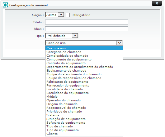 Já com o tipo “Pré-definido” é possível fazer o Qualitor preencher uma combo box com valores definidos em cadastro do próprio Qualitor. Caso esta opção seja definida, um novo campo será apresentado para que se escolha qual tipo de informação pré-definida será utilizada na variável: