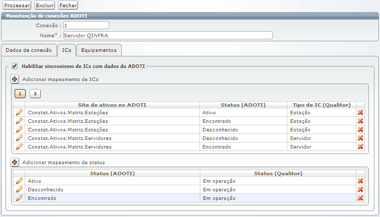 A mesma configuração é realizada para Equipamentos, neste caso, sincronizando os dados obtidos do QInfra para o Qualitor, dentro do módulo de inventário.