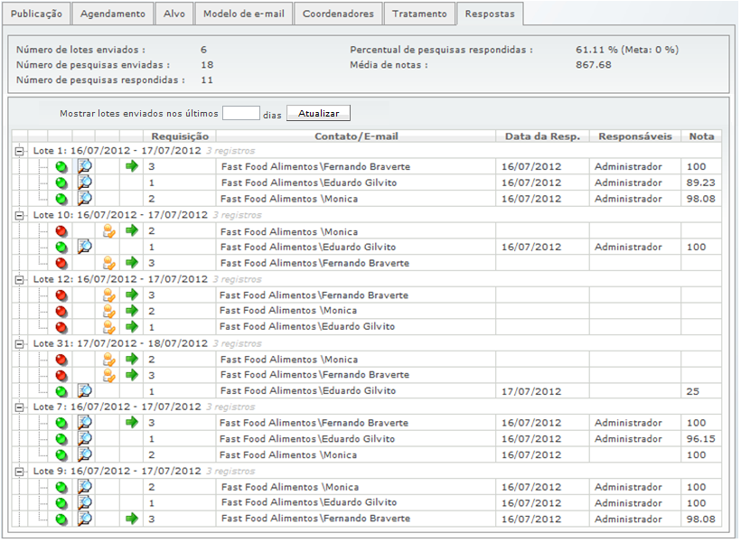 A imagem a seguir demonstra uma publicação que teve 6 lotes enviados, ou seja, em 6 datas diferentes a pesquisa foi disparada para os alvos cadastrados na publicação.