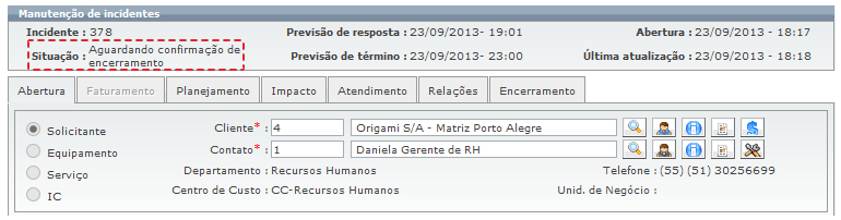 Requisições com esta configuração permanecem na situação “Aguardando confirmação de encerramento” durante o número de dias definidos neste parâmetro. Observe imagem a seguir: