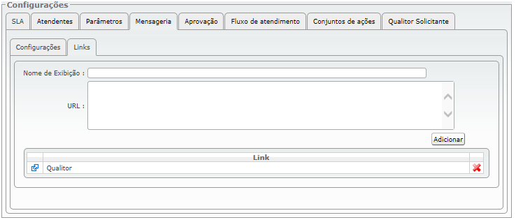 Na guia “Links” é possível cadastrar links personalizados. Estes links estarão disponíveis junto as mensagens enviadas de acordo com a configuração de mensageria da categoria.