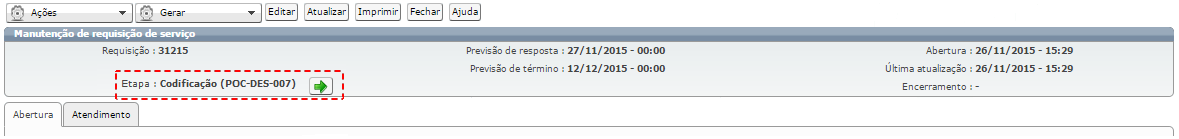 Caso a requisição de serviço seja relacionada a uma instância de processo, a opção de avanço de etapa será apresentada de forma similar à da requisição tradicional, conforme imagem a seguir: