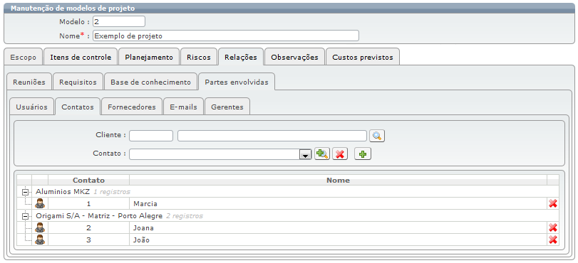 << <%SKIN-STRTRANS-SYNTOC%> >> Navegação: Manual de CONTROLE DE PROJETOS > Controle de Projetos para o Administrador > Modelos de Projetos > Guia "Relações" > Subguia “Partes envolvidas” > “Contatos” |
