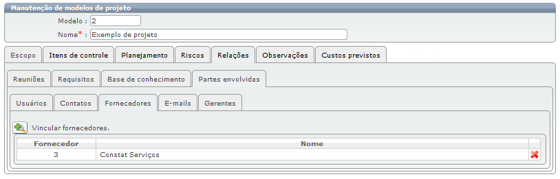 << <%SKIN-STRTRANS-SYNTOC%> >> Navegação: Manual de CONTROLE DE PROJETOS > Controle de Projetos para o Administrador > Modelos de Projetos > Guia "Relações" > Subguia “Partes envolvidas” > “Fornecedores” |