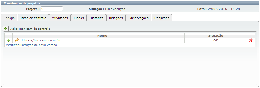A guia "Itens de controle" corresponde a elementos que poderão ser acompanhados de forma destacada e diferenciada quando o projeto estiver em andamento. Algumas vezes são também conhecidos como “pontos críticos” do projeto.