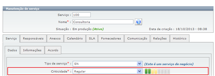 No exemplo acima, o serviço “CONSULTORIA” foi definido com criticidade “REGULAR”.