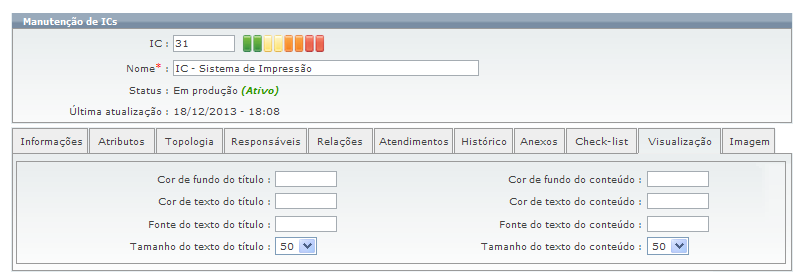 << <%SKIN-STRTRANS-SYNTOC%> >> Navegação: ITIL GERENCIAMENTO DE CONFIGURAÇÃO > Configuração > Menu “Itens de configuração” > Novo IC > Guia “Visualização” |