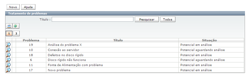 É possível também gerar novos problemas ao clicar no botão “Novo”.