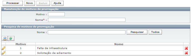 Para cadastrar motivos prorrogação, na tela “Manutenção de motivos de prorrogação”, deve-se simplesmente adicionar o nome do motivo e clicar em “Processar”.
