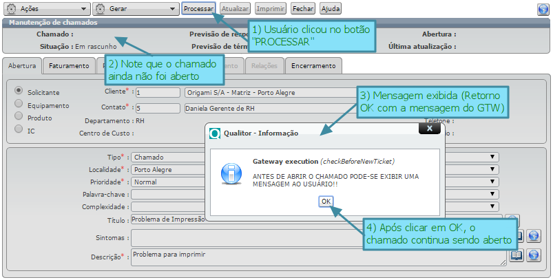 2) O Qualitor valida os campos preenchidos, parâmetros e regras de negócio necessárias para abrir um chamado;